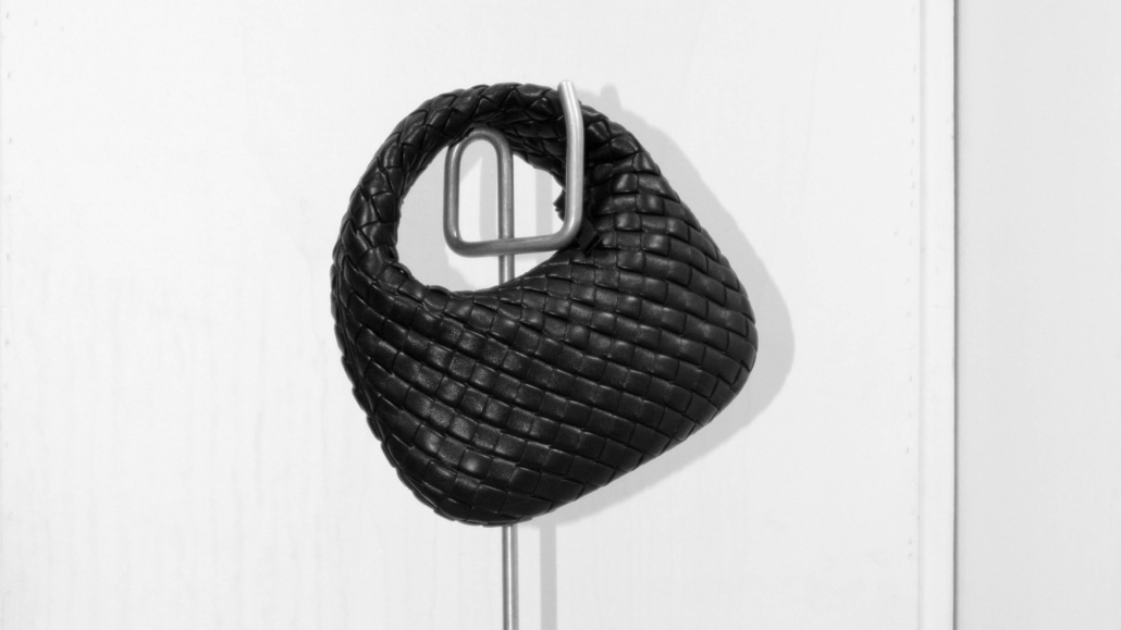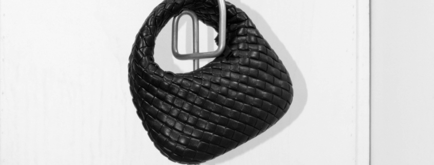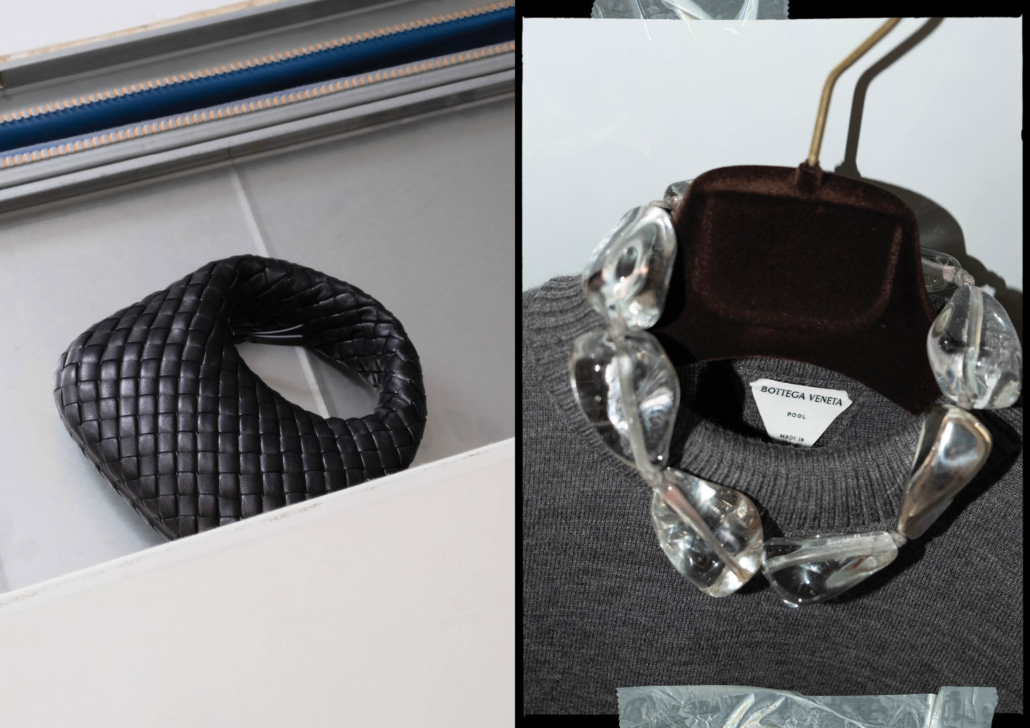編織皮革迷你手提包、PRISMA 造型項鍊 、羊毛圓領針織衫|ALL BY BOTTEGA VENETA。