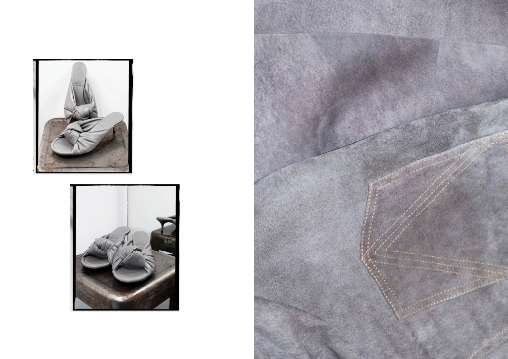 CHERRY 穆勒細跟涼鞋 、麂皮造型長褲|ALL BY BOTTEGA VENETA。