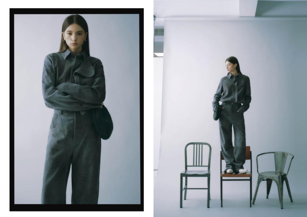 麂皮造型夾克、麂皮造型長褲、GONDOLA 穆勒鞋、VENETA 編織皮革迷你手提包、PRISMA 造型耳環| ALL BY BOTTEGA VENETA。