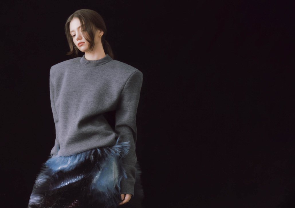 羊毛圓領針織衫、聚酯纖維流蘇裙、PRISMA 造型耳環| ALL BY BOTTEGA VENETA。