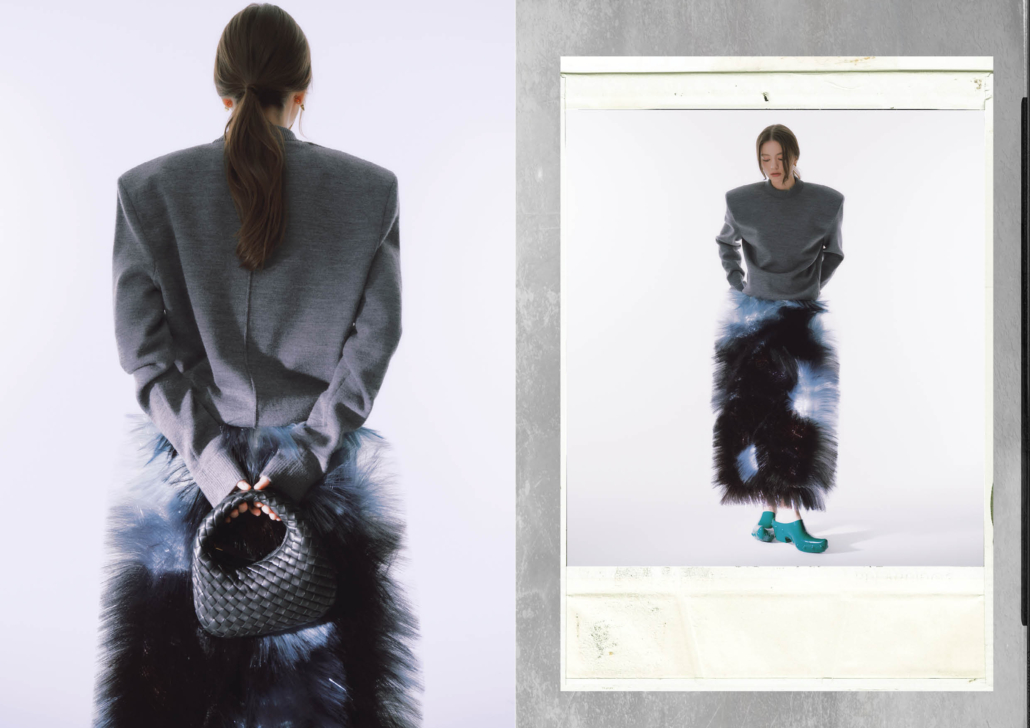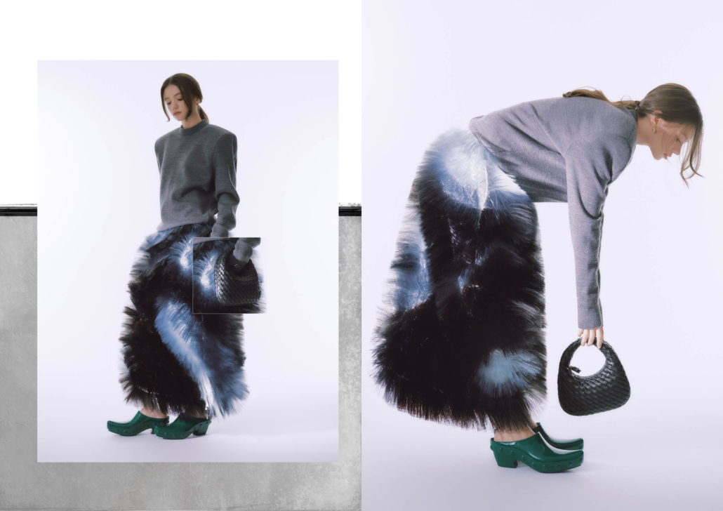 羊毛圓領針織衫、聚酯纖維流蘇裙、PRISMA 造型耳環、GONDOLA 穆勒鞋| ALL BY BOTTEGA VENETA。
