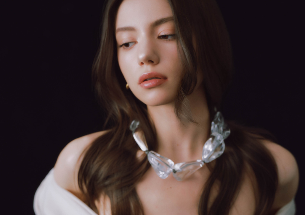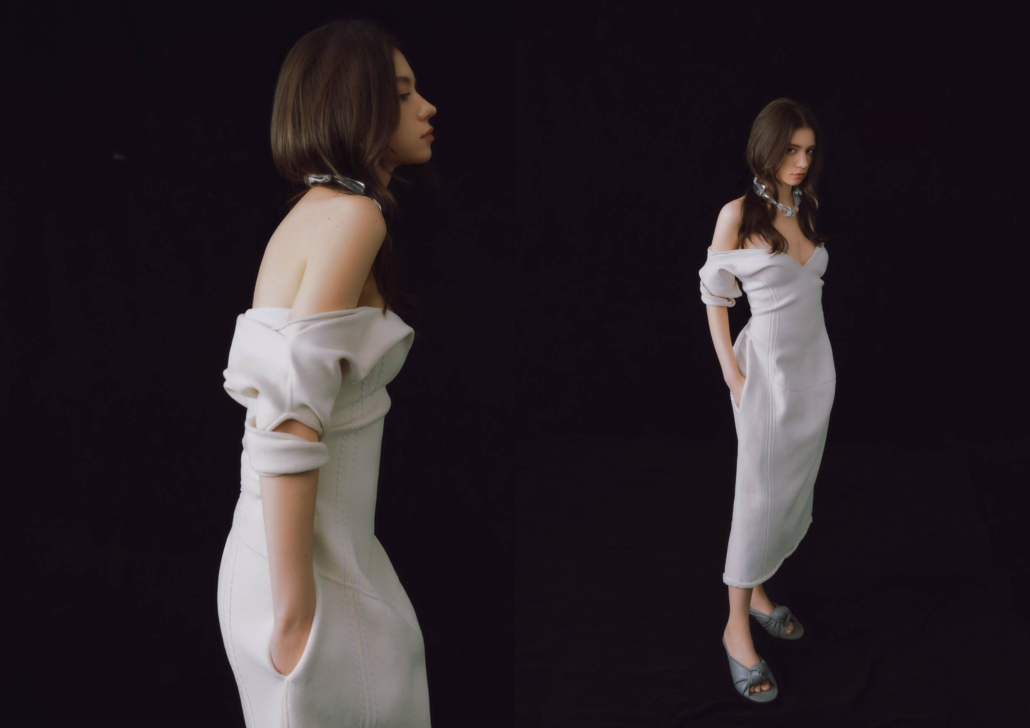 雙層皺褶針織落肩洋裝、CHERRY穆勒細跟涼鞋、PRISMA 造型項鍊、RISMA造型耳環| ALL BY BOTTEGA VENET。