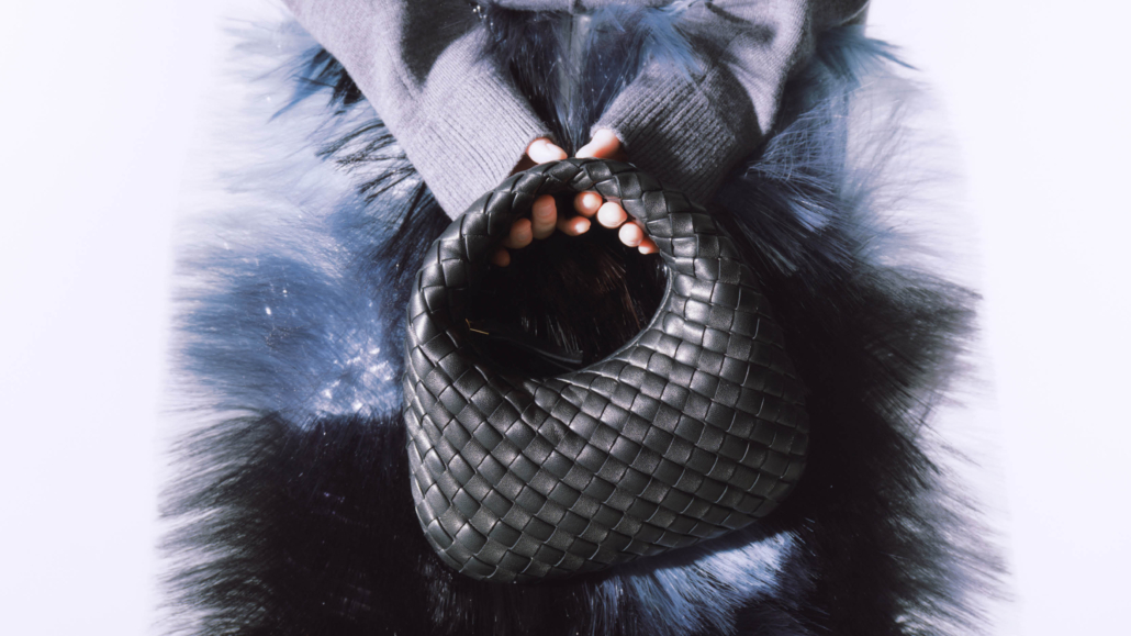 羽毛造型皮革上衣、編織皮革手提包、皮革寬管長褲| ALL BY BOTTEGA VENETA。