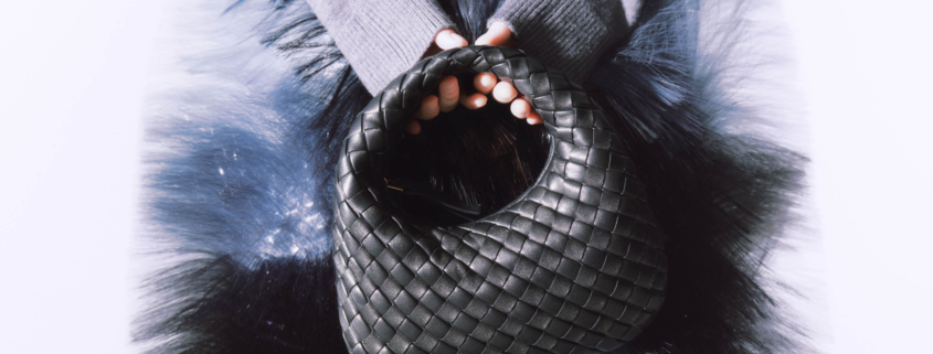 皮革抓皺造型洋裝、 GIOCO 編織皮革手提包、 PRISMA 造型耳環| ALL BY BOTTEGA VENETA。